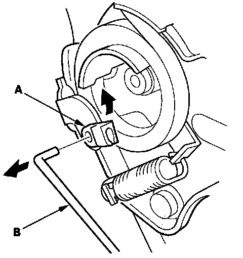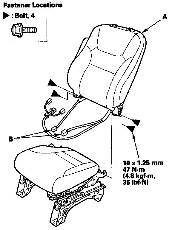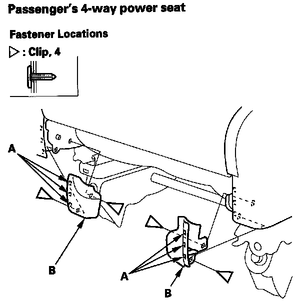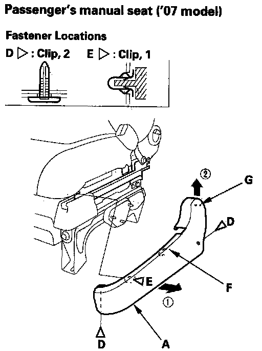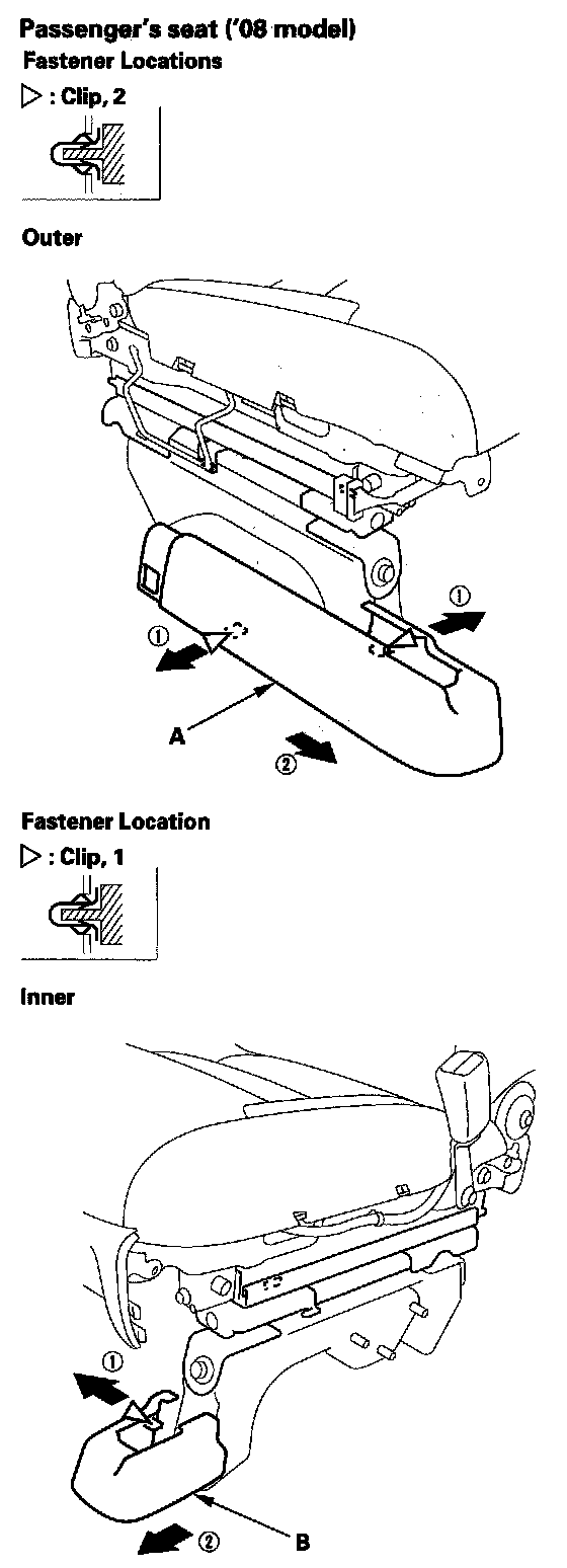 11. '07 model passenger's manual seat: Detach the rod fastener (A), then remove the recline rod (B).