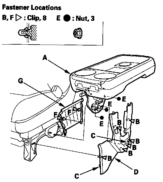 3. Detach the clips (F), then remove the center table inner cover (G) from the center table.