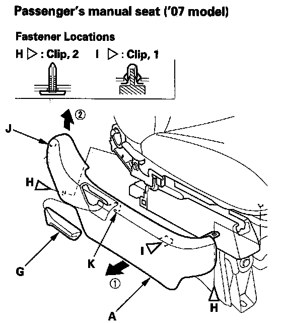 4. Detach the clip (I), and release the hooks (J, K), then remove the recline cover.