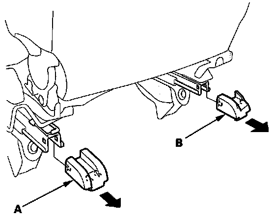 9. Remove the front outer seat track cover (A) and front inner seat track cover (B).
