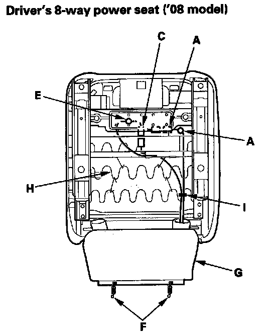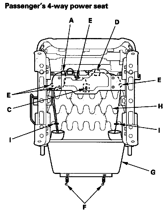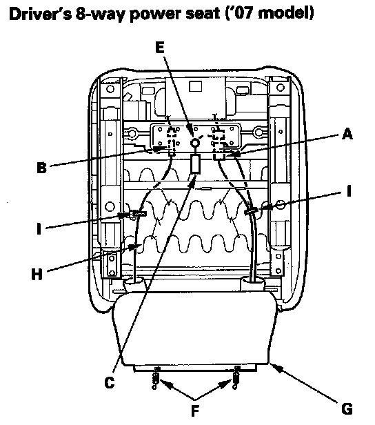 13. From under the seat cushion, disconnect the recline motor subharness connector (A), and if equipped, the seat-back heater connector (B) on the driver's 8-way power seat. Disconnect the side airbag connector (C), the OPDS/ODS unit connector (D) on the passenger's seat, and detach harness clips (E). Release the hook springs (F) and seat cushion cover (G) from the seat cushion frame spring (H), then pull the cover back, and release the wire ties (I).