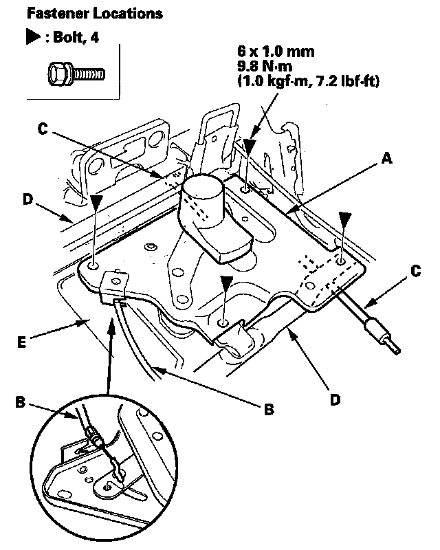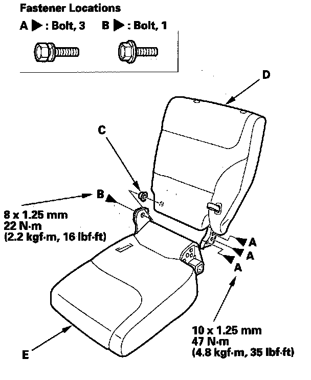 11. Left third row seat: Remove the bolts (A; B) and bushing (C), then separate the seat-back (D) and seat cushion (E). Take care not to kink the cables.