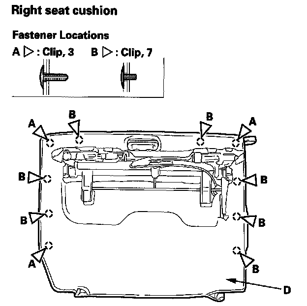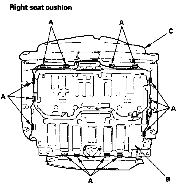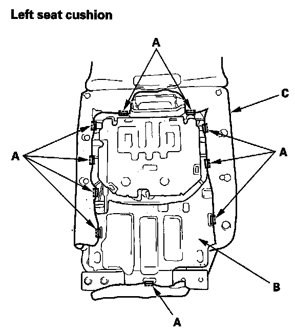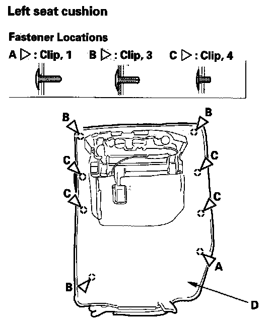 17. Release the clips (A, B, C). Remove over the seat cushion mat (D).