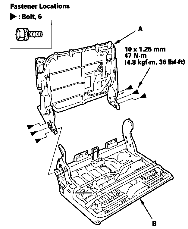 23. Remove the bolts, then separate the right seat-back frame (A) and right seat cushion frame (B).