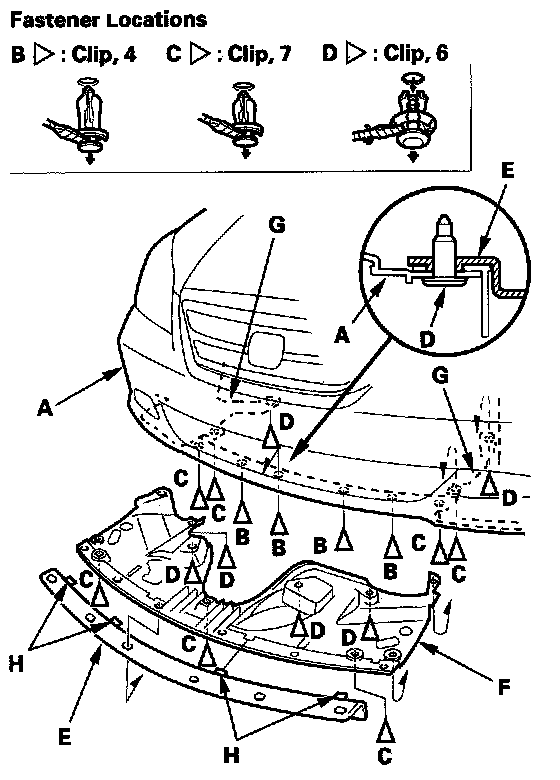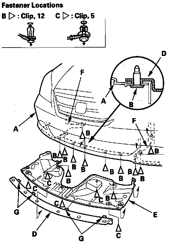 1. From under the front bumper (A), remove the clips (B, C, D) securing the front bumper, front bumper air spoiler (E), front splash shield (F), and front inner fender (G) on the front suspension subframe and body.