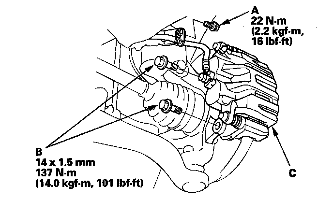 4. Remove the brake caliper bracket mounting bolts (B), then remove the caliper assembly (C) from the knuckle. To prevent damage to the caliper assembly or brake hose, use a short piece of wire to hang the caliper assembly from the undercarriage. Do not twist the brake hose excessively.