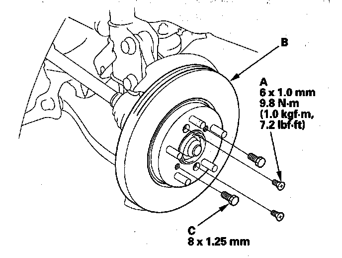 NOTE: If the brake disc is stuck to the front hub, thread two 8 x 1.25 mm bolts (C) into the brake disc to push it away from the front hub. Turn each bolt 90° at a time to prevent the brake disc from binding.
