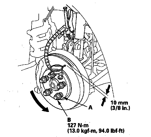 5. Install suitable flat washers (A) and the wheel nuts (B), and tighten the wheel nuts to the specified torque to hold the brake disc securely against the hub.