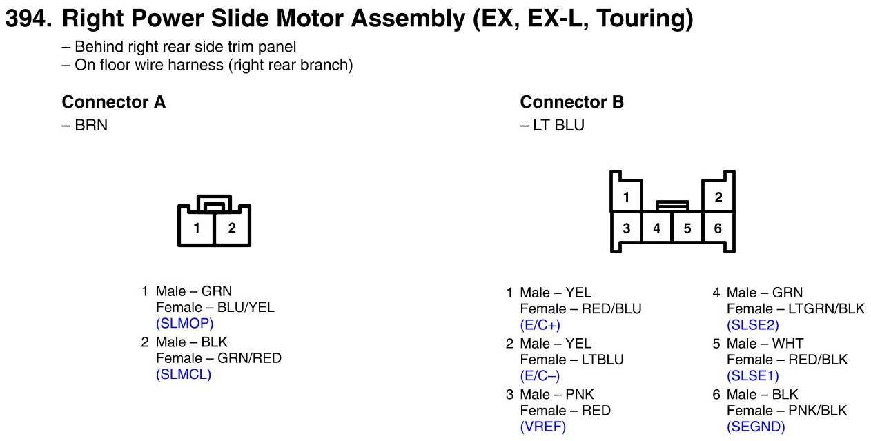 View 394 - Right Power Slide Motor Assembly Connector View (EX, EX-L, Touring)