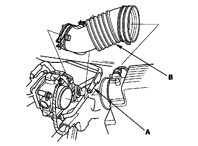 10. Remove the breather pipe (A), then remove the intake air duct (B).