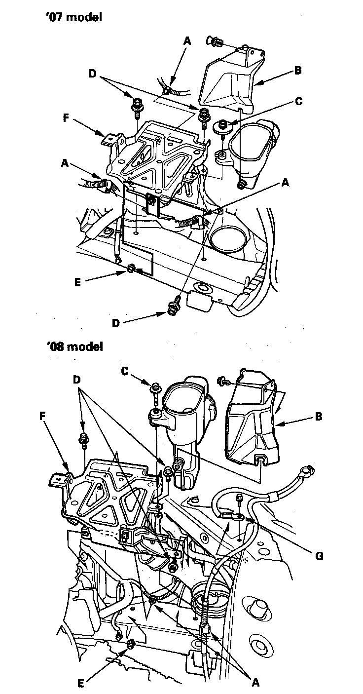 26. '08 model J35A7 engine: Remove the harness clamp (A), then disconnect the battery cable (B) from the under-hood fuse/relay box.