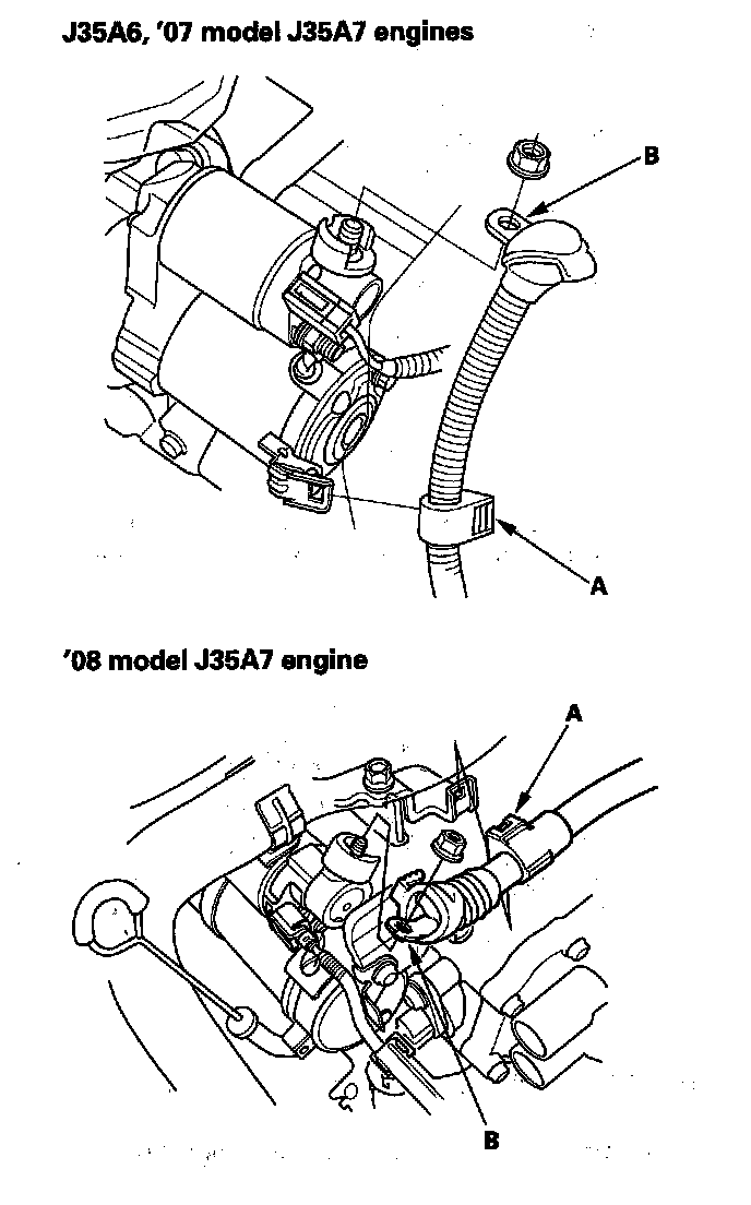 25. J35A6, '07 model J35A7 engines: Remove the harness clamps (A), then remove the alternator cable (B).