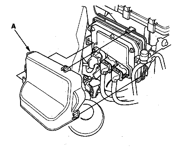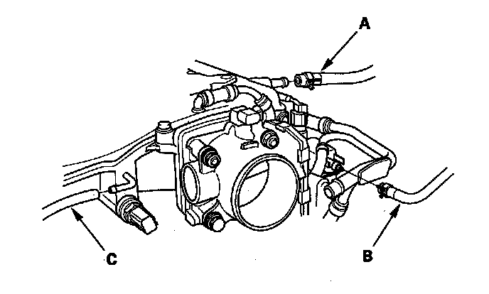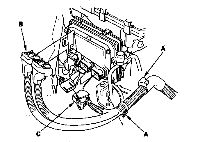 12. Remove the harness clamps (A), the intake air duct covet (B), and the bolt (C) holding the intake air duct.