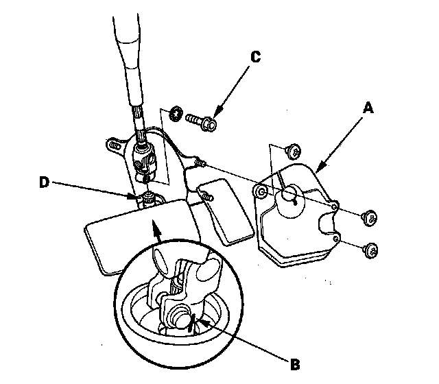 22. Make a reference mark (B) across the steering joint and the steering gearbox pinion shaft. Remove the steering joint bolt (C), and disconnect the steering joint from the steering gearbox pinion shaft (D).
