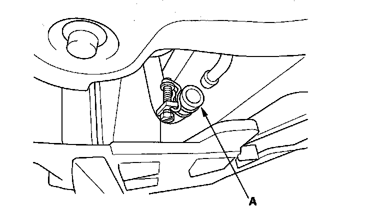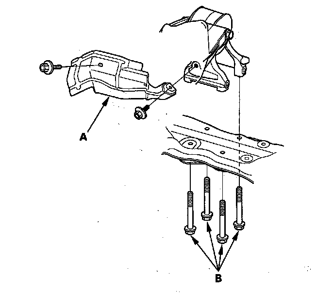 64. J35A6 engine: Remove the heat shield (A) and the rear engine mount bolts (B).