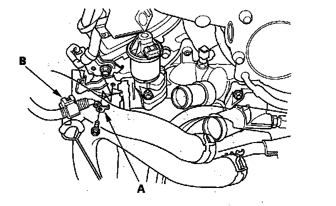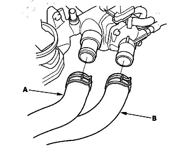 49. Remove the upper radiator hose (A) and the lower radiator hose (B).