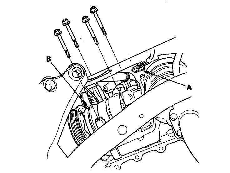 55. Disconnect the A/C compressor clutch connector (A), then remove the A/C compressor (B) without disconnecting the A/C hoses.
