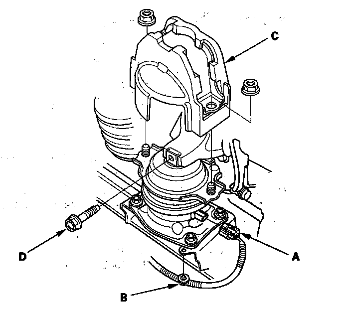 62. J35A7 engine: Disconnect the front active control engine mount (ACM) actuator connector (A) and the harness clamp (B), remove the front engine mount stop (C), then remove the front engine mount bolt (D).