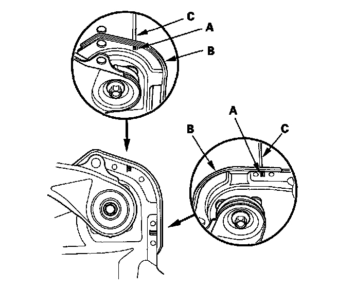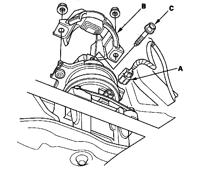 61. J35A6 engine: Remove the front engine mount control solenoid valve tube (A) and the front engine mount stop (B), then remove the front engine mount bolt (C).