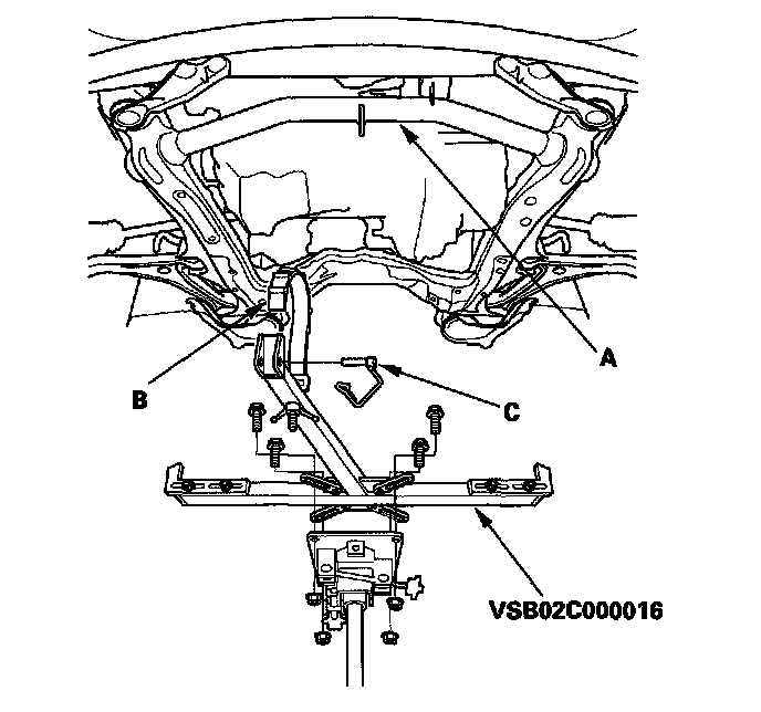 67. Attach the front subframe adapter (VSB02C000016) to the subframe (A) by hanging the belt (B) over the front of the subframe, then secure the belt with its retaining pin (C).