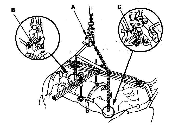 71. Attach a chain hoist (A) to the engine hook (B) and the transmission hook (C), then lift up the engine/transmission until it is securely supported by the chain hoist, and remove the engine support hanger and the engine hanger adapters.