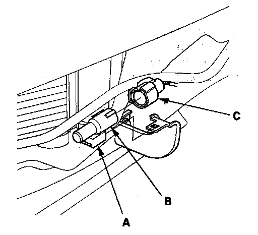 2. Lift the tab (A) to release the lock, then remove the outside air temperature sensor (B). Disconnect the 2P connector (C) from the outside air temperature sensor.