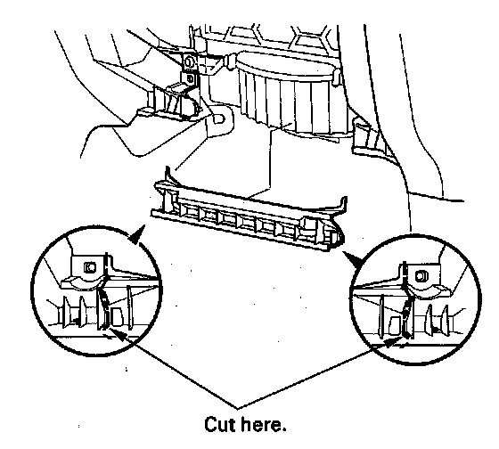 3. Cut the plastic cross brace in the glove box opening with diagonal cutters in the area shown, and discard it.