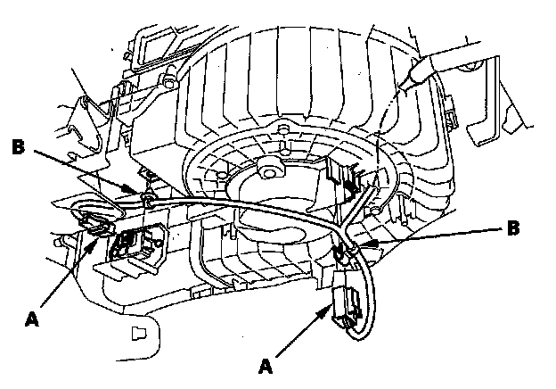 4. Disconnect the connectors (A) from the front blower motor and the front power transistor, then remove the wire harness clips (B).