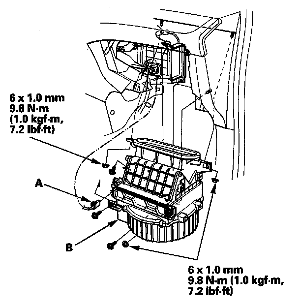 5. Disconnect the connector (A) from the recirculation control motor, then remove the bolts, the mounting nuts and the blower unit (B).