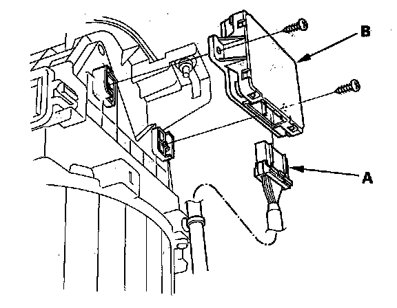 2. Disconnect the connector (A) from the front climate control unit (B), then remove the self-tapping screws and the front climate control unit.
