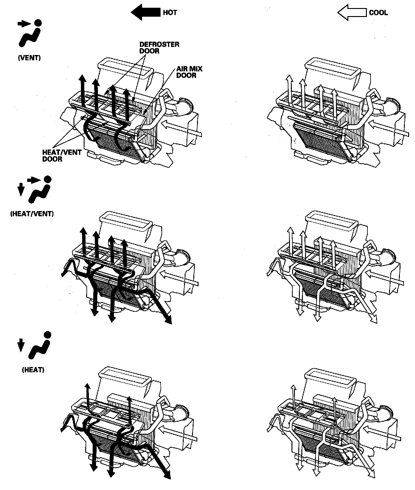 System DescriptionThe air conditioning system removes heat from the passenger compartment by transferring heat from the ambient air to the evaporator. The evaporator cools the air with the refrigerant that is circulating through the evaporator. The refrigerant expands in the evaporator, and the evaporator becomes very cold and absorbs the heat from the ambient air. The blower fan pushes air across the evaporator where the heat is absorbed, and then it blows the cool air into the passenger compartment.