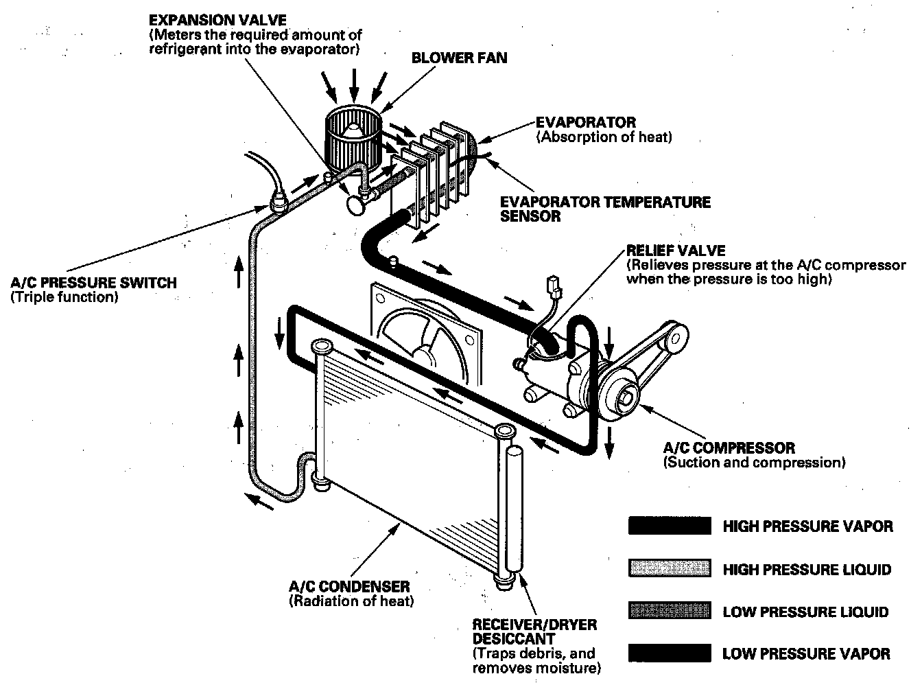 System DescriptionThe air conditioning system removes heat from the passenger compartment by transferring heat from the ambient air to the evaporator. The evaporator cools the air with the refrigerant that is circulating through the evaporator. The refrigerant expands in the evaporator, and the evaporator becomes very cold and absorbs the heat from the ambient air. The blower fan pushes air across the evaporator where the heat is absorbed, and then it blows the cool air into the passenger compartment.