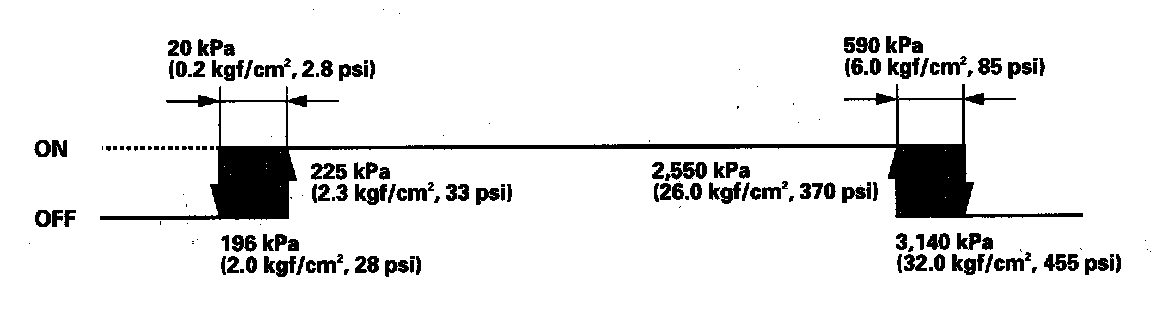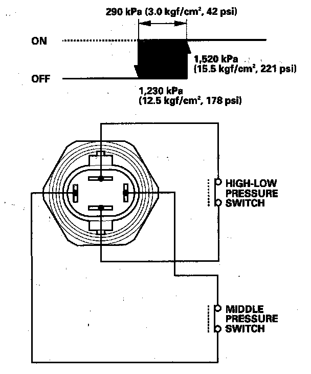 If the refrigerant pressure goes above 1,520 kPa (15.5 kgf/sq.cm, 221 psi), the A/C pressure switch closes to signal the PCM to change the speed of the A/C condenser fan and radiator fan to high. When the refrigerant pressure drops below 1,230 kPa (12.5 kgf/sq.cm, 178 psi), the A/C pressure switch opens to signal the PCM to change the speed of the A/C condenser fan and radiator fan to low.