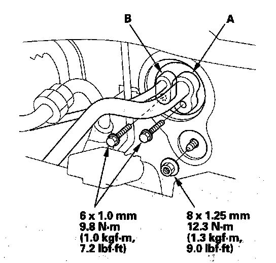 6. Remove the bolts, inlet and outlet pipes (A), and expansion valve (B).