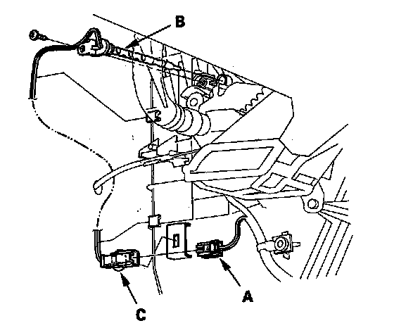 2. Disconnect the 2P connector (A) from the evaporator temperature sensor (B), then remove the connector clip (C). Remove the self-tapping screw, and carefully pull out the evaporator temperature sensor.