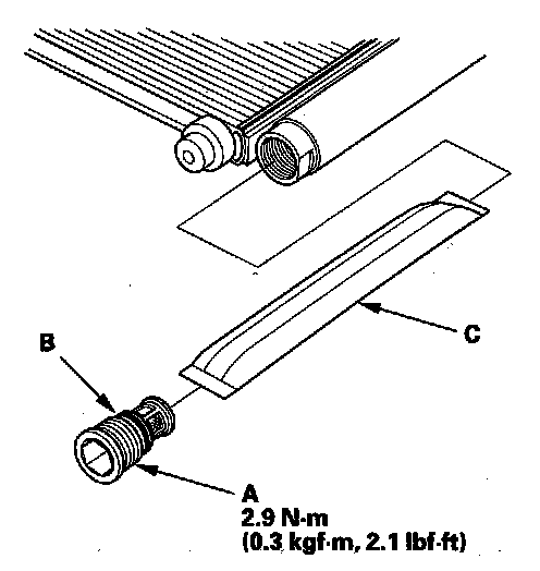 2. Remove the cap (A) from the bottom of the A/C condenser. Remove the O-ring (B) and the desiccant (C).