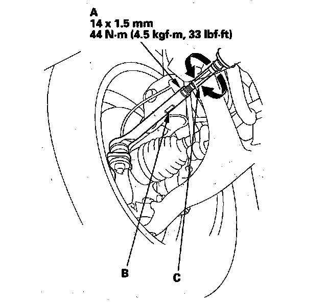 4. Loosen the tie-rod locknuts; (A) while holding the flat surface sections (B) of the tie-rod end with a wrench. Turn both tie-rods (C) until the front toe is within specifications.