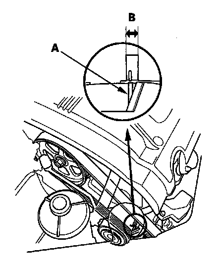 2. Check that the auto-tensioner indicator (A) on the oil pump not beyond the edge of the indicator rib (B) on the auto-tensioner. If the pointer is beyond the indicator rib, replace the drive belt.