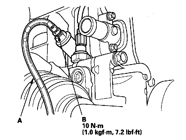 4. Install a rubber hose (A) on the drain bolt (B) located at the rear of the engine block, then loosen the drain bolt.