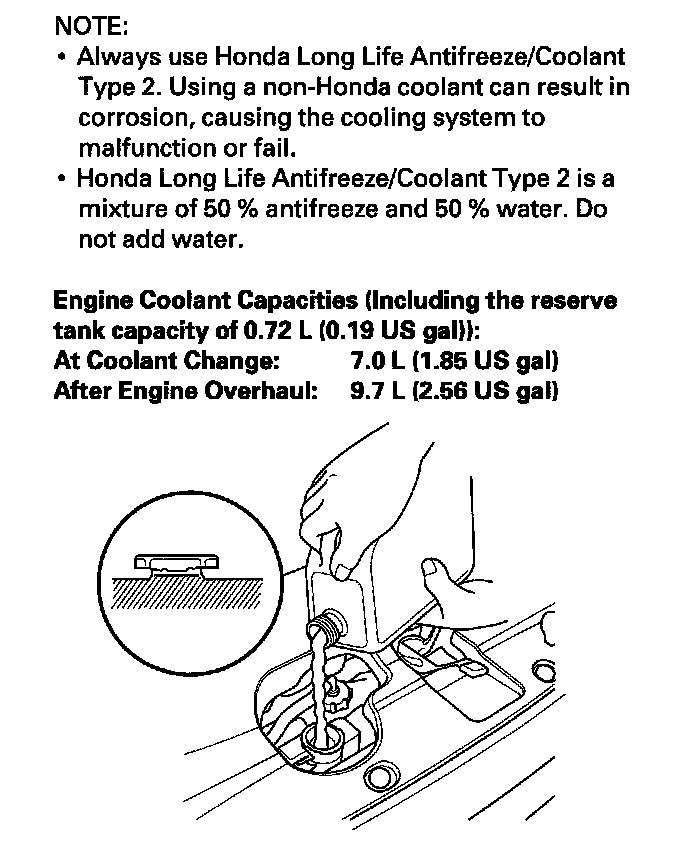 19. Check the level in the radiator, and add Honda Long Life Antifreeze/Coolant Type 2, if needed.