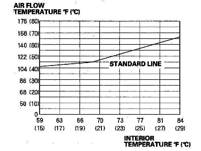 22. Set the climate control or heater control panel to maximum heat, and select high speed heat mode on the rear control panel. Measure the temperature of the air from the rear floor vent for 3 minutes. Make sure the temperature is above the standard line of the graph as shown. If the temperature is below the standard line, repeat steps 16 through 19 several more times. Then loosely install the radiator cap and recheck.