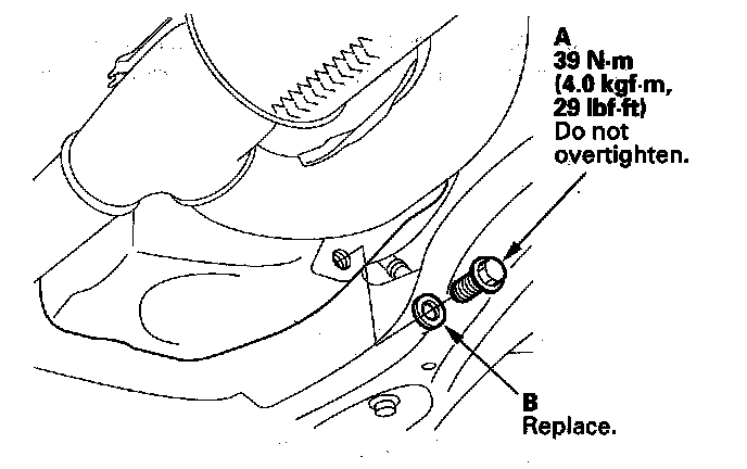 3. Reinstall the drain bolt with a new washer (B).
