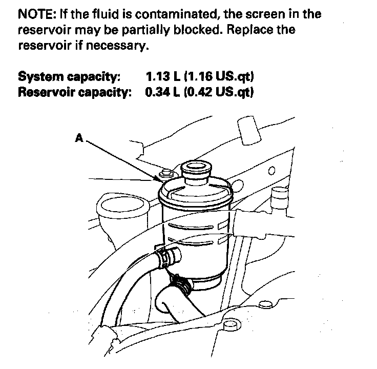 Fluid ReplacementCheck the reservoir (A) at regular intervals, and add the recommended fluid as necessary. Always use Honda Power Steering Fluid. Using of any other type of power steering fluid or automatic transmission fluid can cause increased wear and poor steering in cold weather.