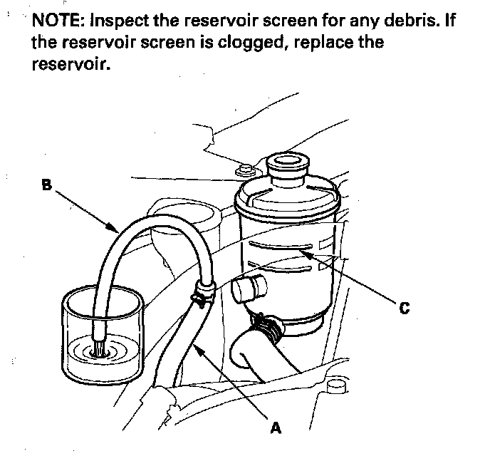 1. Remove the power steering reservoir from its holder. Raise the reservoir, then disconnect the return hose (A) to drain the reservoir. Take care not to spill the fluid on the body and parts. Wipe off any spilled fluid at once.