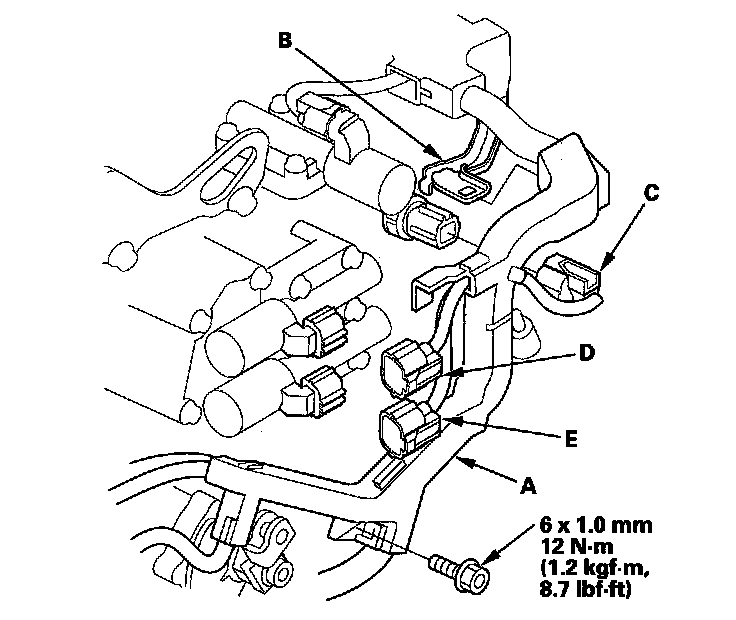 15. Disconnect the A/T clutch pressure control solenoid valve A connector (D), the A/T clutch pressure control solenoid valve B connector (E), the shift solenoid harness connector, the transmission range switch connector, the ATF temperature sensor connector, the output shaft (countershaft) speed sensor connector, the input shaft (mainshaft) speed sensor connector, and the 3rd clutch transmission fluid pressure switch connector.