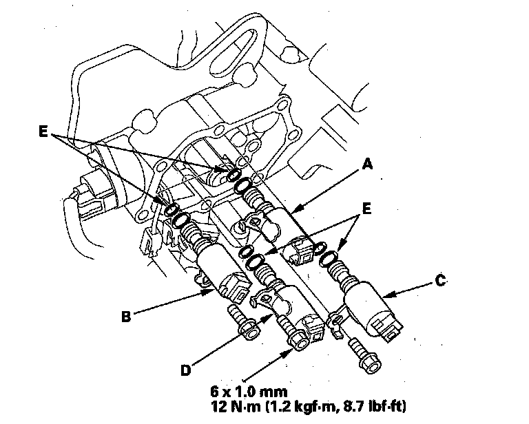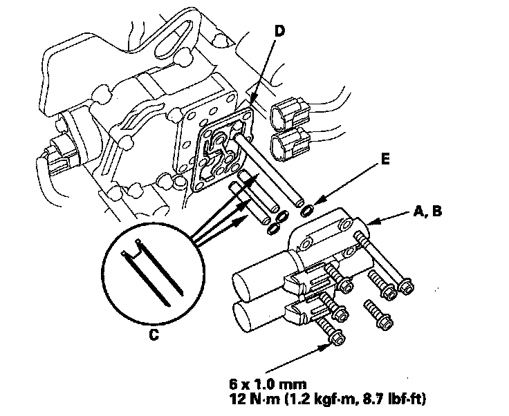 NOTE: Do not install shift solenoid valve C before installing shift solenoid valve A. If shift solenoid valve C is installed before installing shift solenoid valve A, it may damage the hydraulic control system.