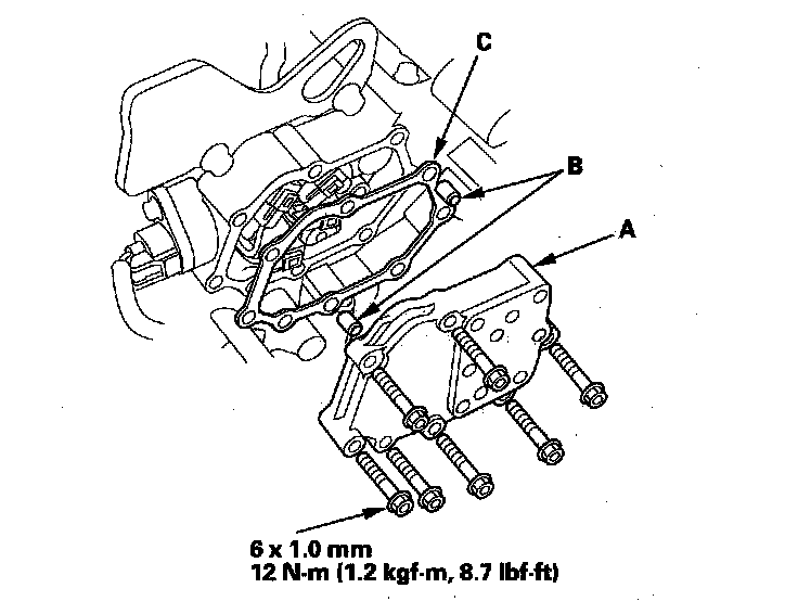 18. Remove the solenoid, valve cover (A), the dowel pins (B), and the gasket (C).