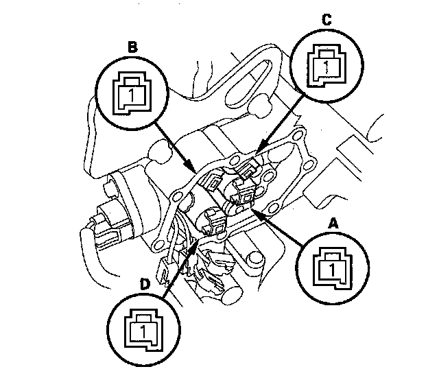 20. Disconnect shift solenoid valve A connector (A), shift solenoid valve B connector (B), shift solenoid valve C connector (C), and shift solenoid valve D connector (D).