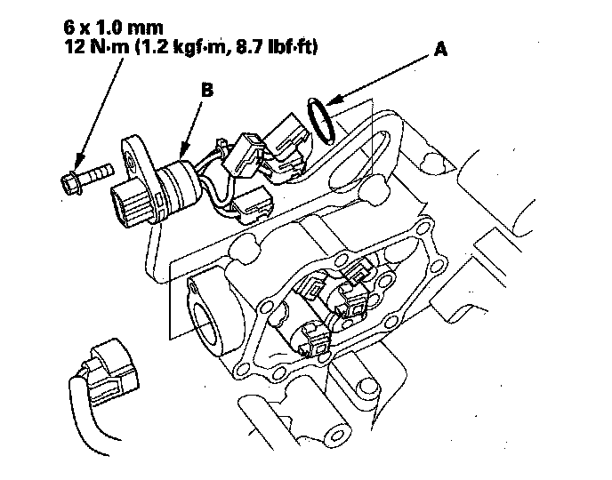 23. Remove the solenoid harness, and install a new O-ring (A) on the shift solenoid harness connector (B), and install the connector in the transmission housing.