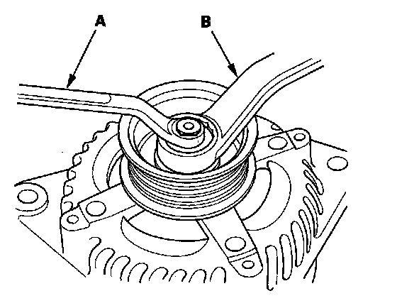 3. If the front bearing needs replacing, remove the pulley locknut with a 10 mm wrench (A) and a 22 mm wrench (B). If necessary, use an impact wrench.